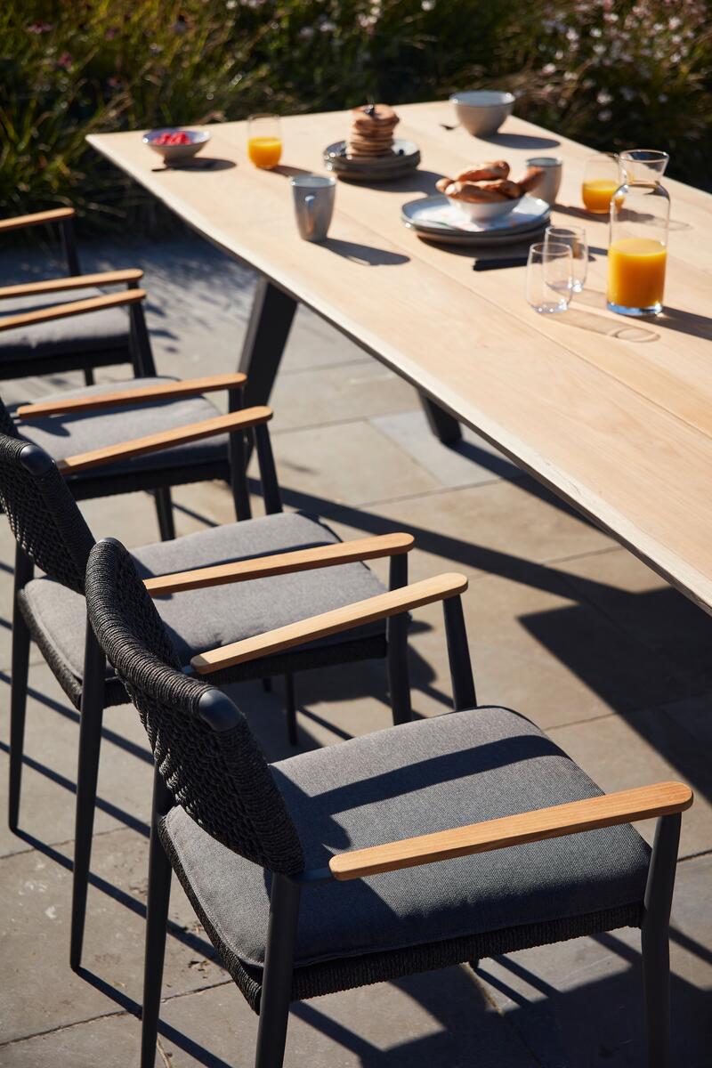 Područky mají detail teakového dřeva, které dodává židli přírodní a elegantní vzhled, zatímco lanový výplet nabízí komfort a nadčasovou estetiku.