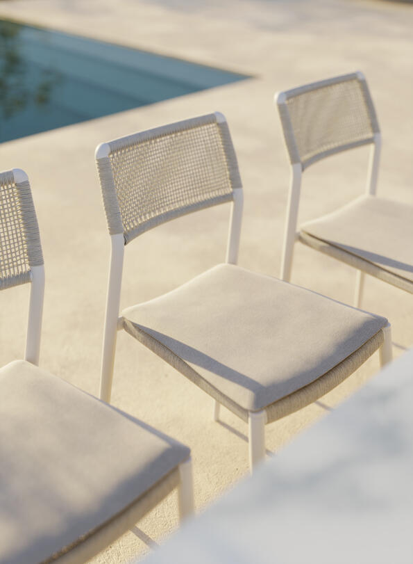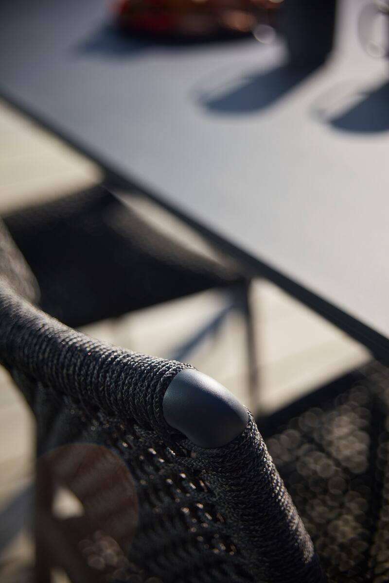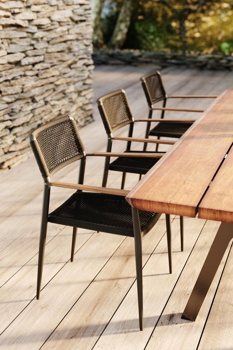 Venkovní jídelní židle s moderním designem a lanovým výpletem. Varianta s područkami i bez područek.