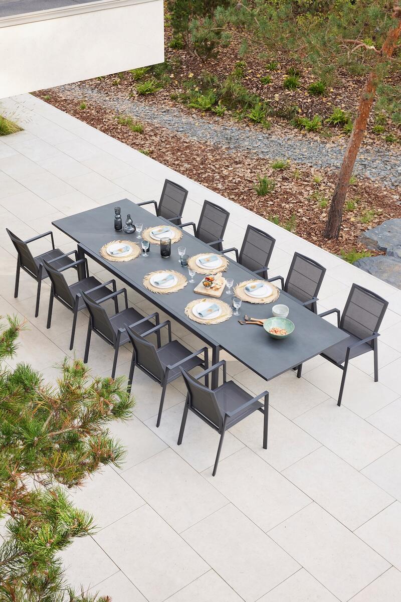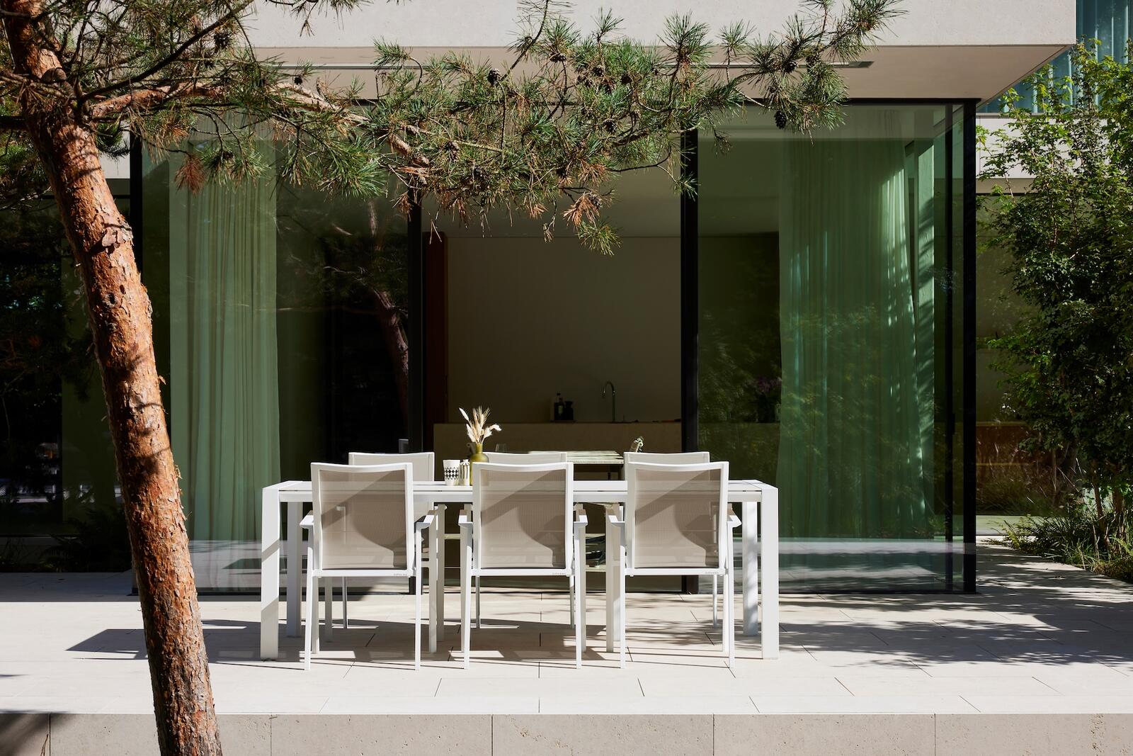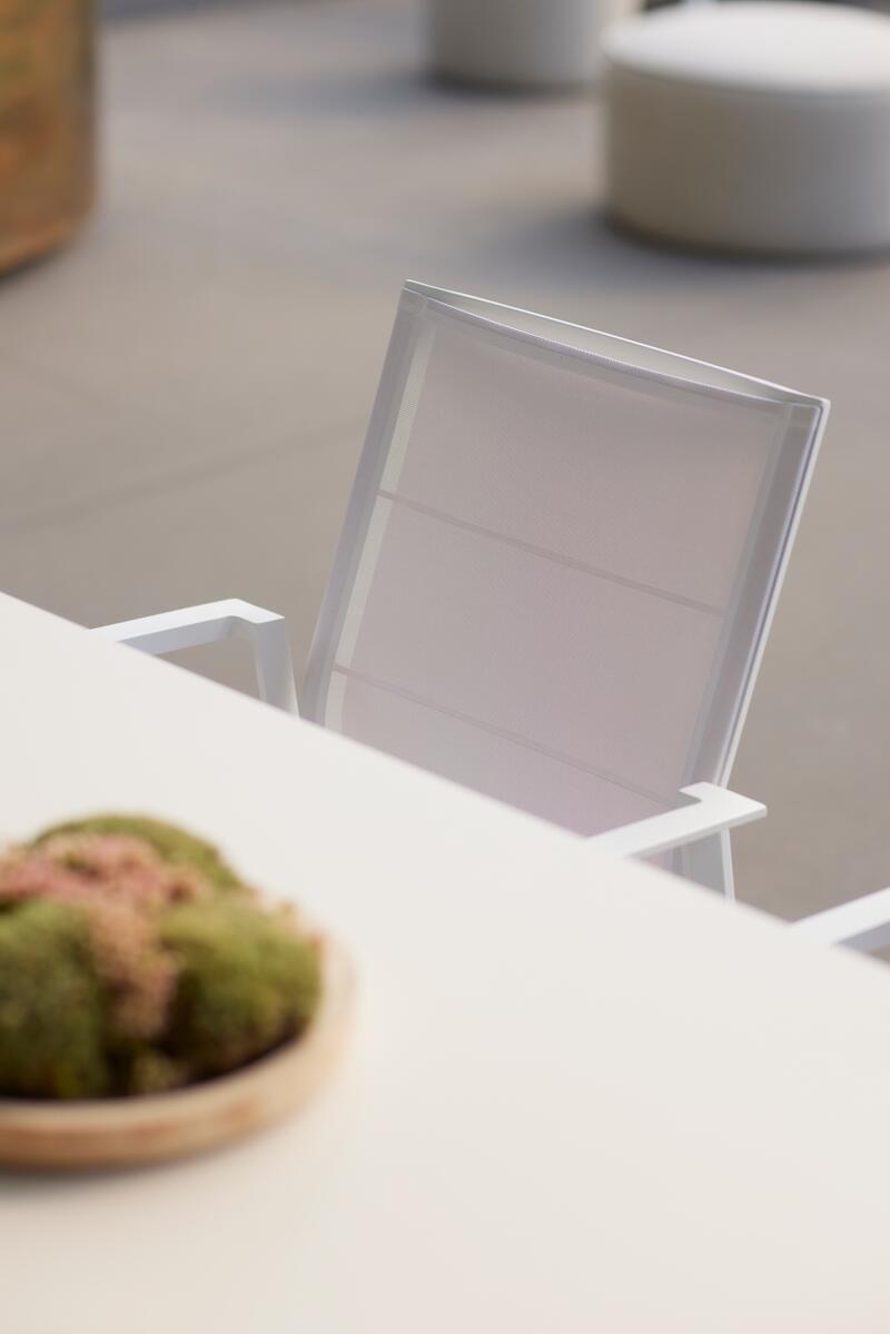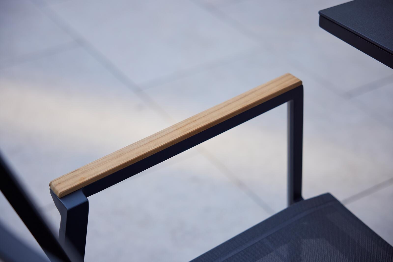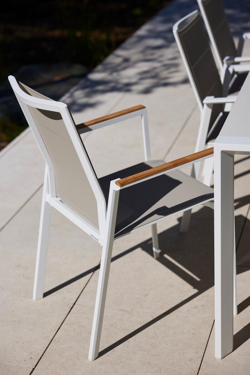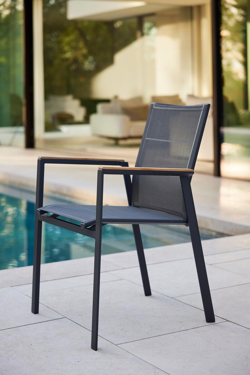 Venkovní jídelní židle Selectas područkami kombinuje moderní design, funkčnost a pohodlí. Dostupná ve dvou variantách – s lehkou hliníkovou konstrukcí pro elegantní a odolné řešení, nebo s teakovými područkami, které dodávají židli přírodní akcent a teplejší vzhled.