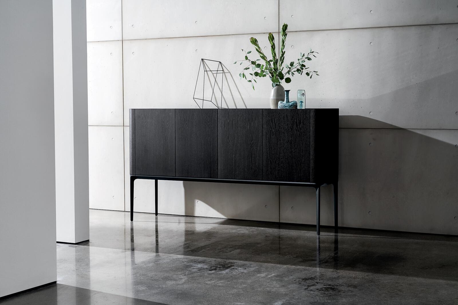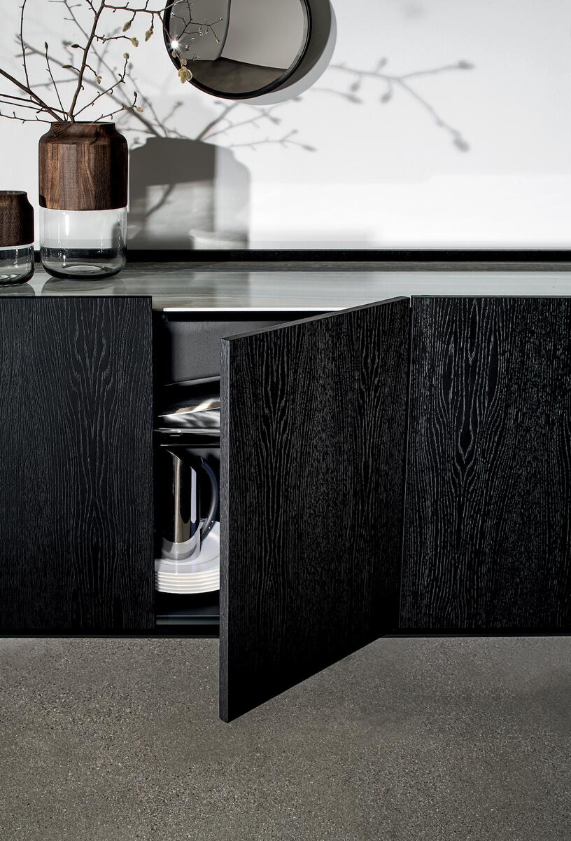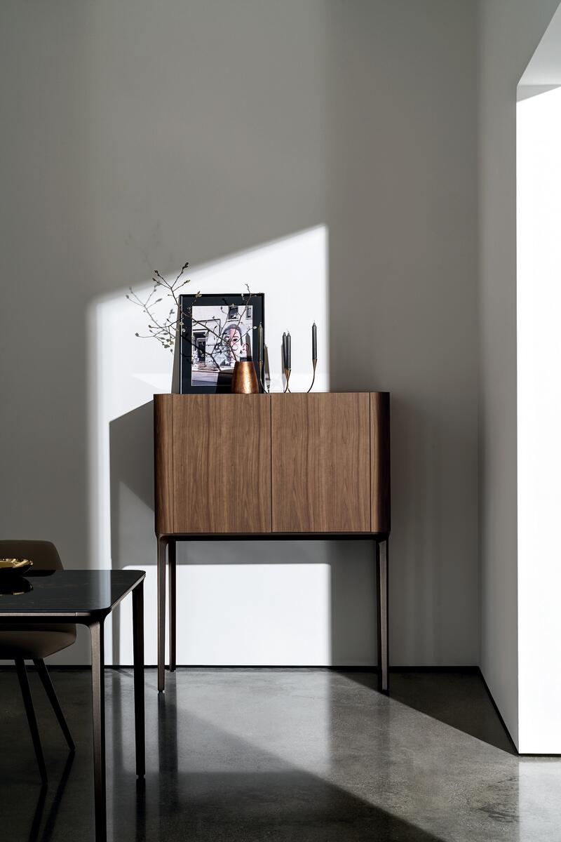 Její rozdílné varianty umožňují přizpůsobit úložný prostor vašim potřebám. Potřebujete knihovnu, bar nebo elegantní skříň do kanceláře na úschovu vašich šanonů? Tohle vše najdete v této komodě.