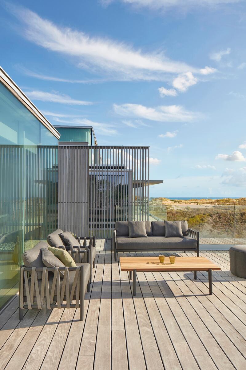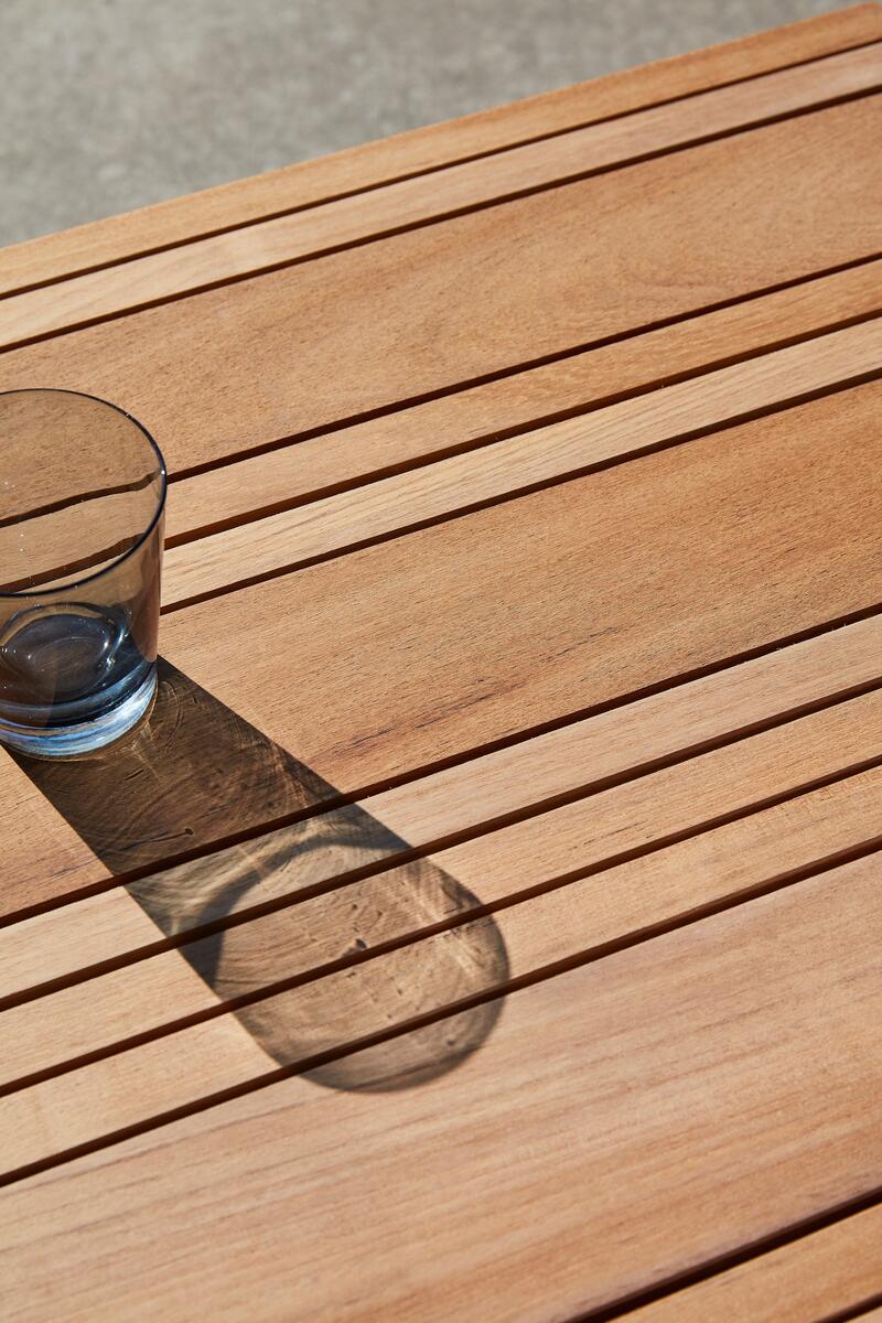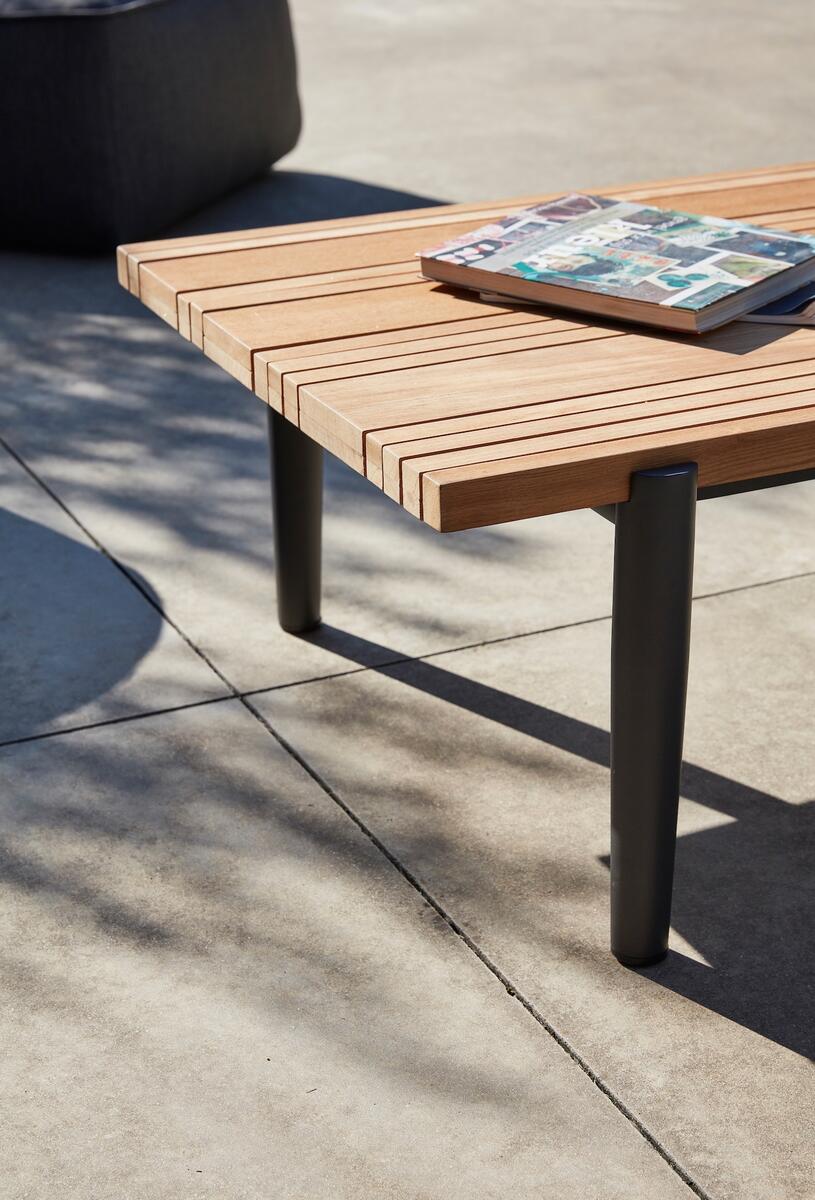 Konferenční stolek s deskou z keramiky nebo teakového dřeva – elegantní design pro venkovní prostor.