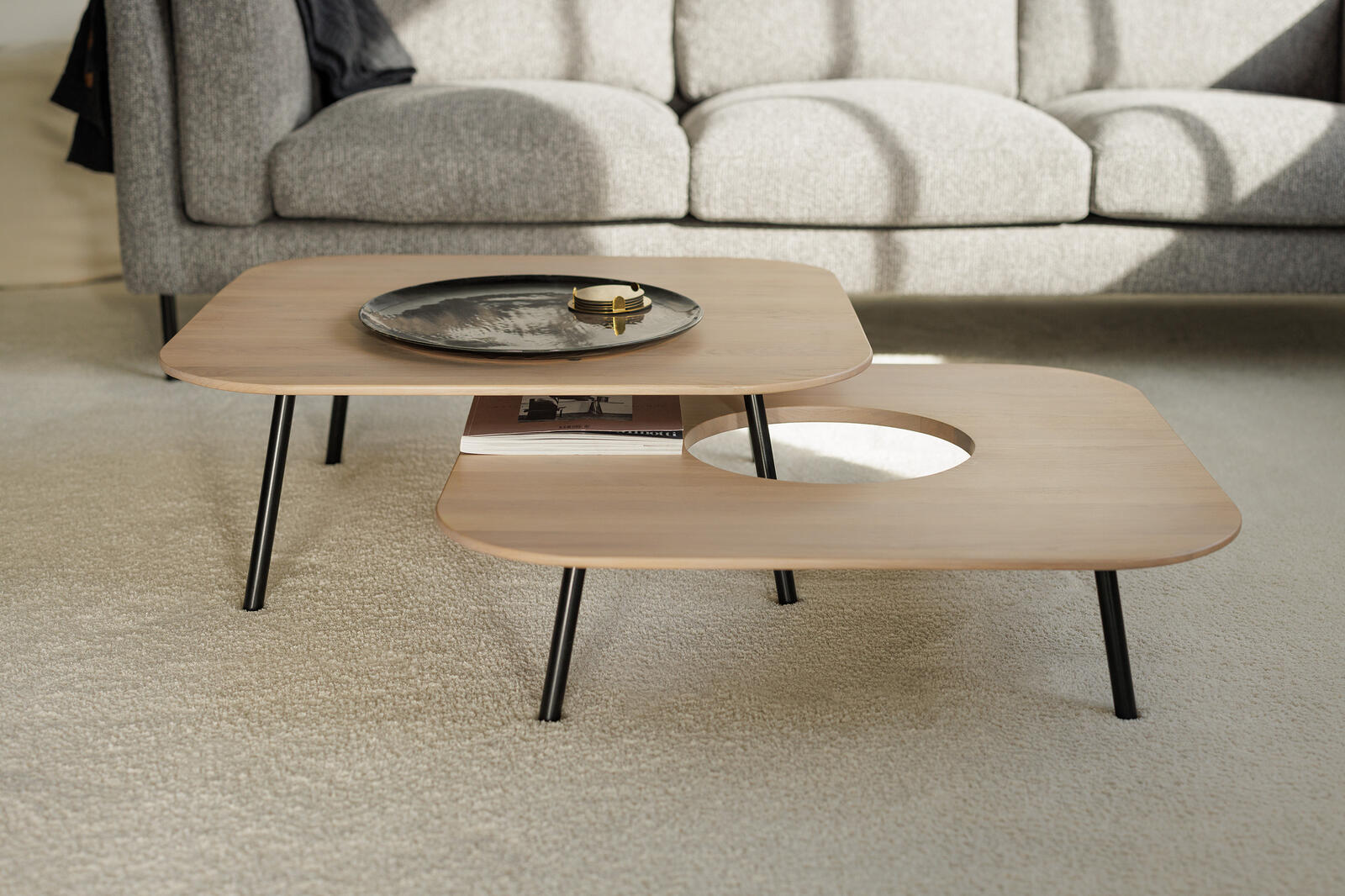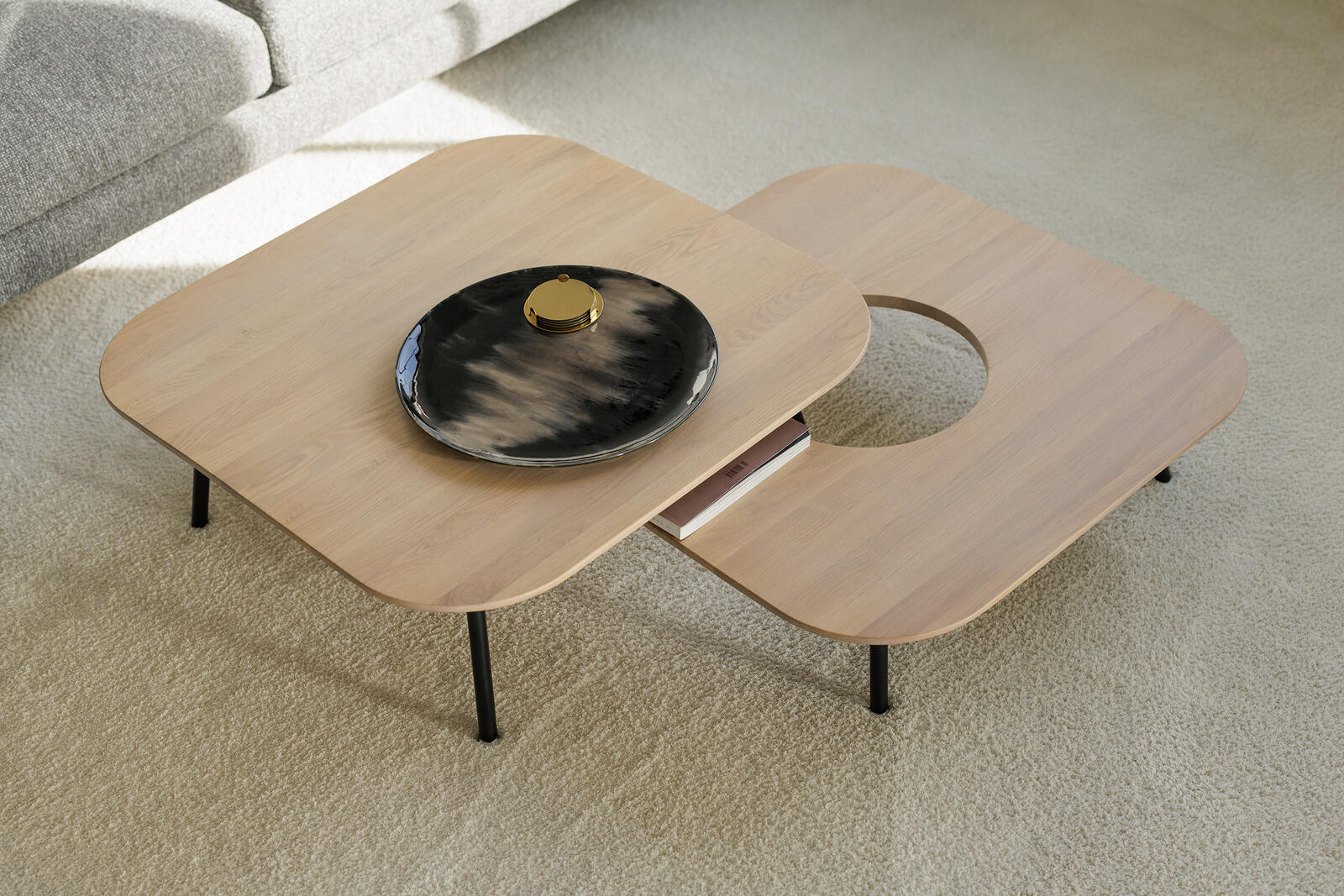 Konferenční dřevěné stolky Tetris s kovou podnoží nabízejí spoustu prostoru pro kreativitu. Díky jejich atypickému designu je můžete je libovolně skombinovat nebo použít jako samostatné stolky.