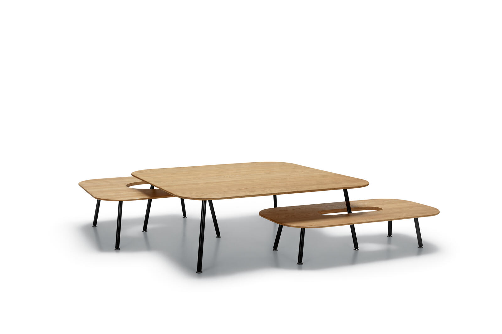 Kompaktní konferenční stolky s dřevěnou deskou a kovovou podnoží. Fungují jako set ale i jednotlivě.