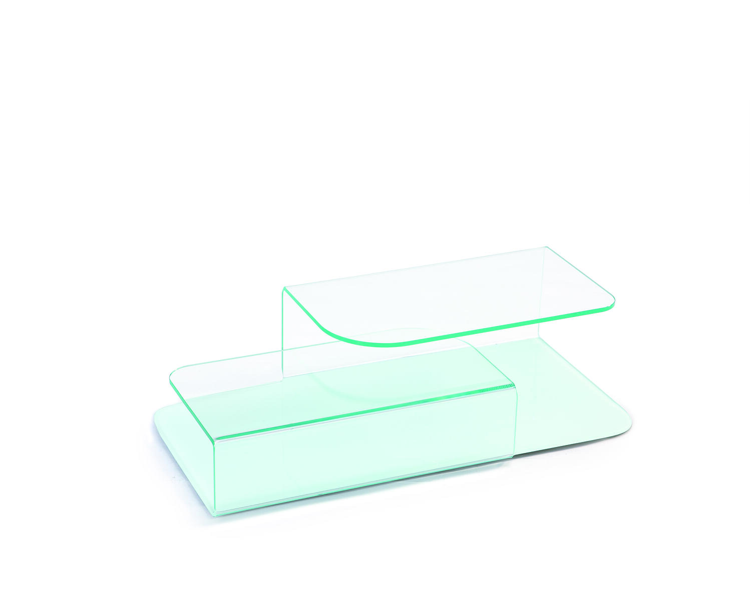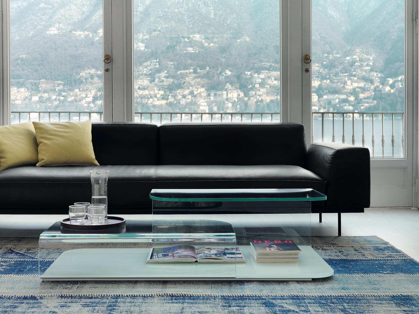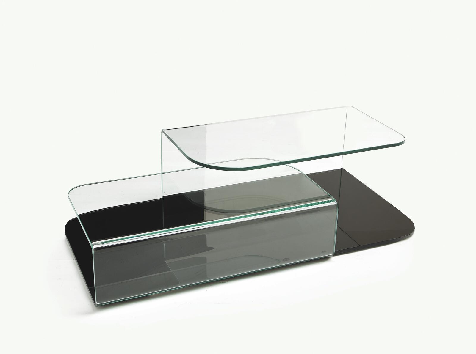 Moderní a minimalistický design konferenčního stolku z ohýbaného skla.