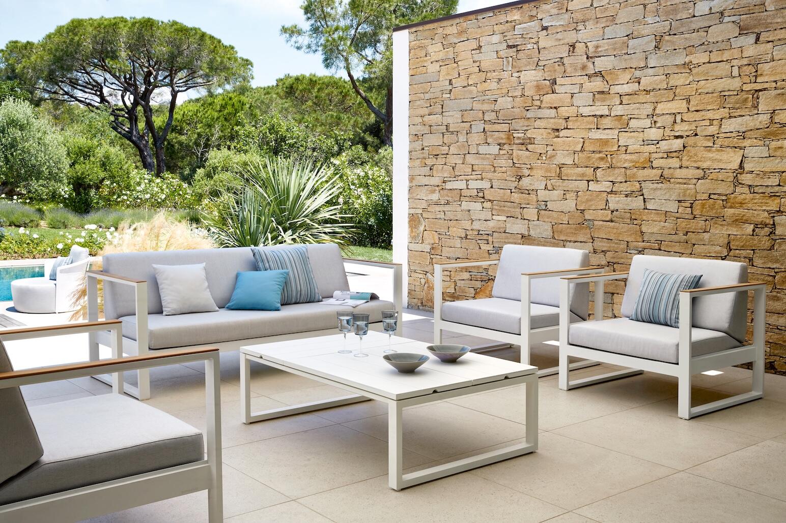 Moderní venkovní křeslo na terasu. Lehká hliníková konstrukce doplněná o pohodlné polstrování.