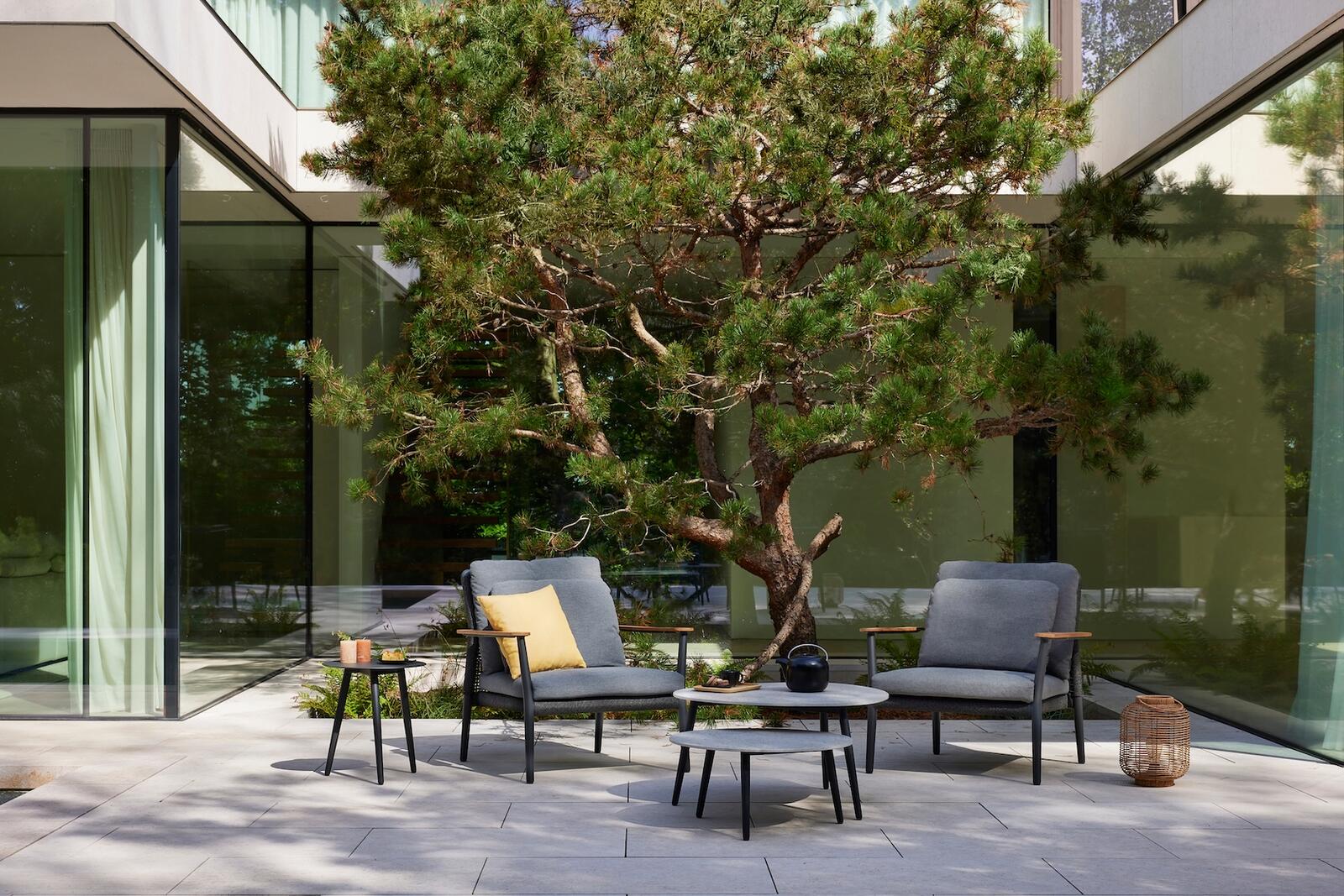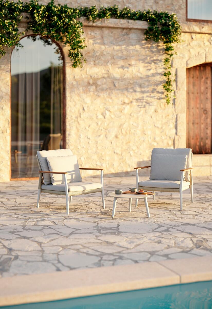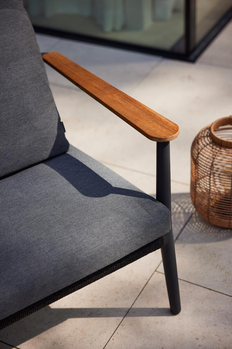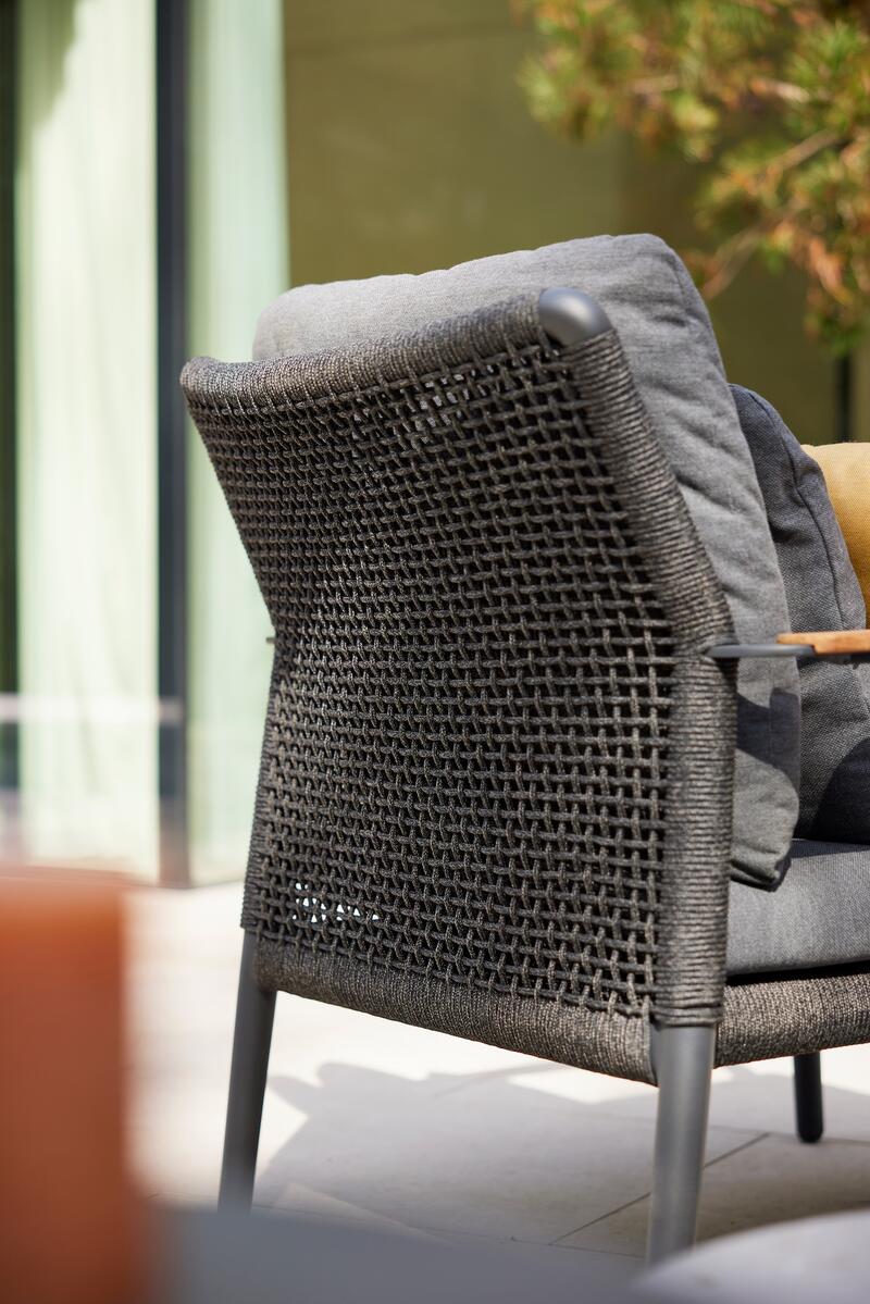 Elegantní venkovní křeslo s područkami a lanovým výpletem. Nízký a komfortní posed.