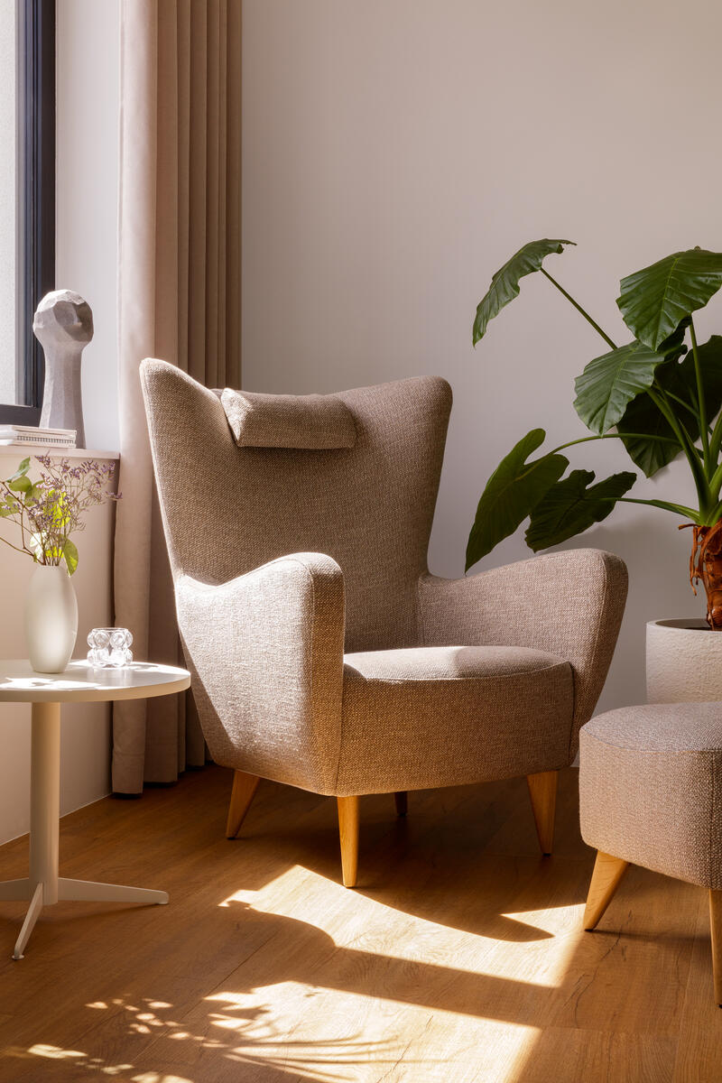 Křeslo ušák v moderním designu. Ergonomie křesla a podnožník přináší maximální komfort.