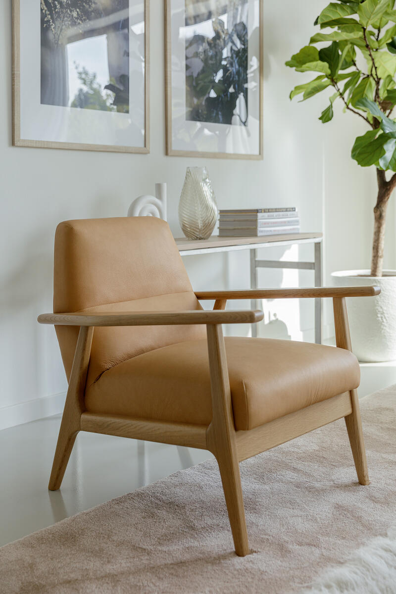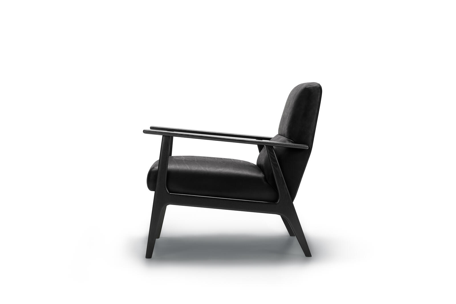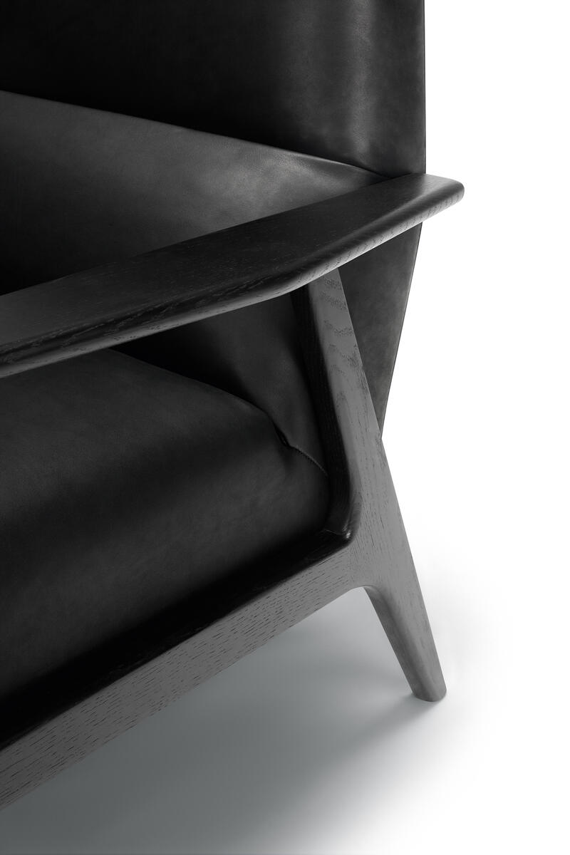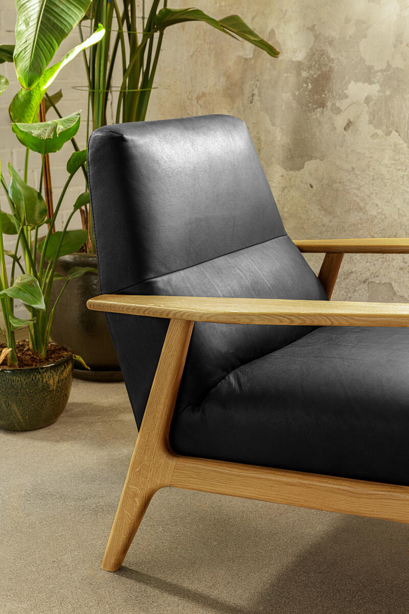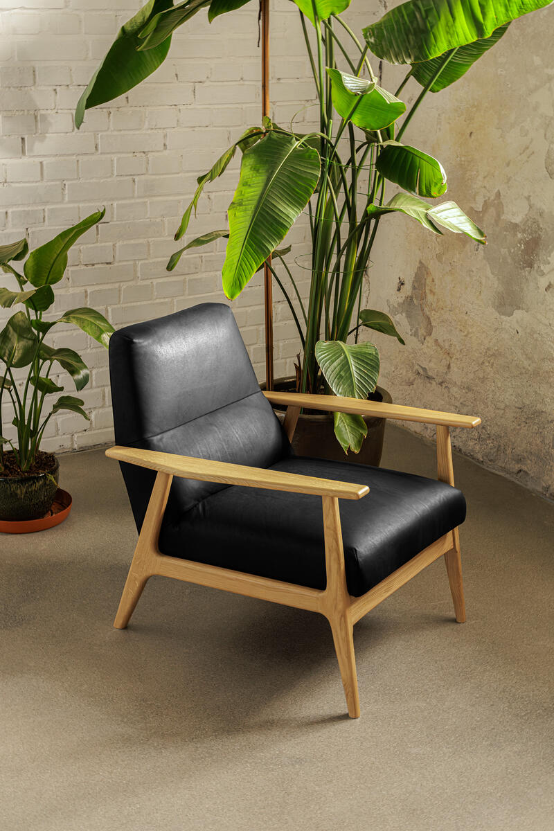 Nadčasový design. Dřevěný rám křesla s variantou koženého nebo látkového čalounění.