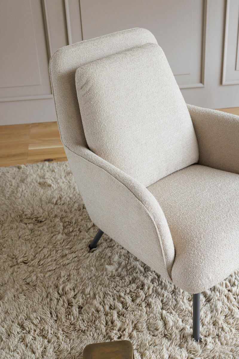 Čalouněné křeslo s výraznou kovovou podnoží. Tenké linie a moderní vzhled však dává mnoho prostoru pro výběr vhodné potahové látky.