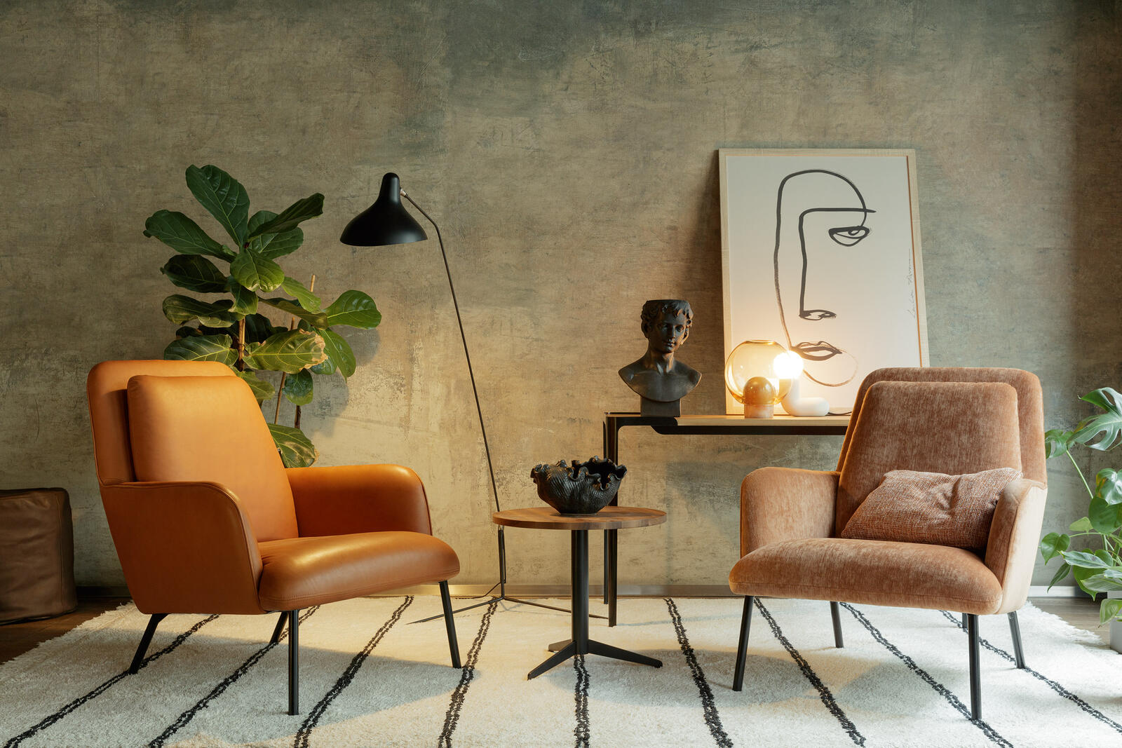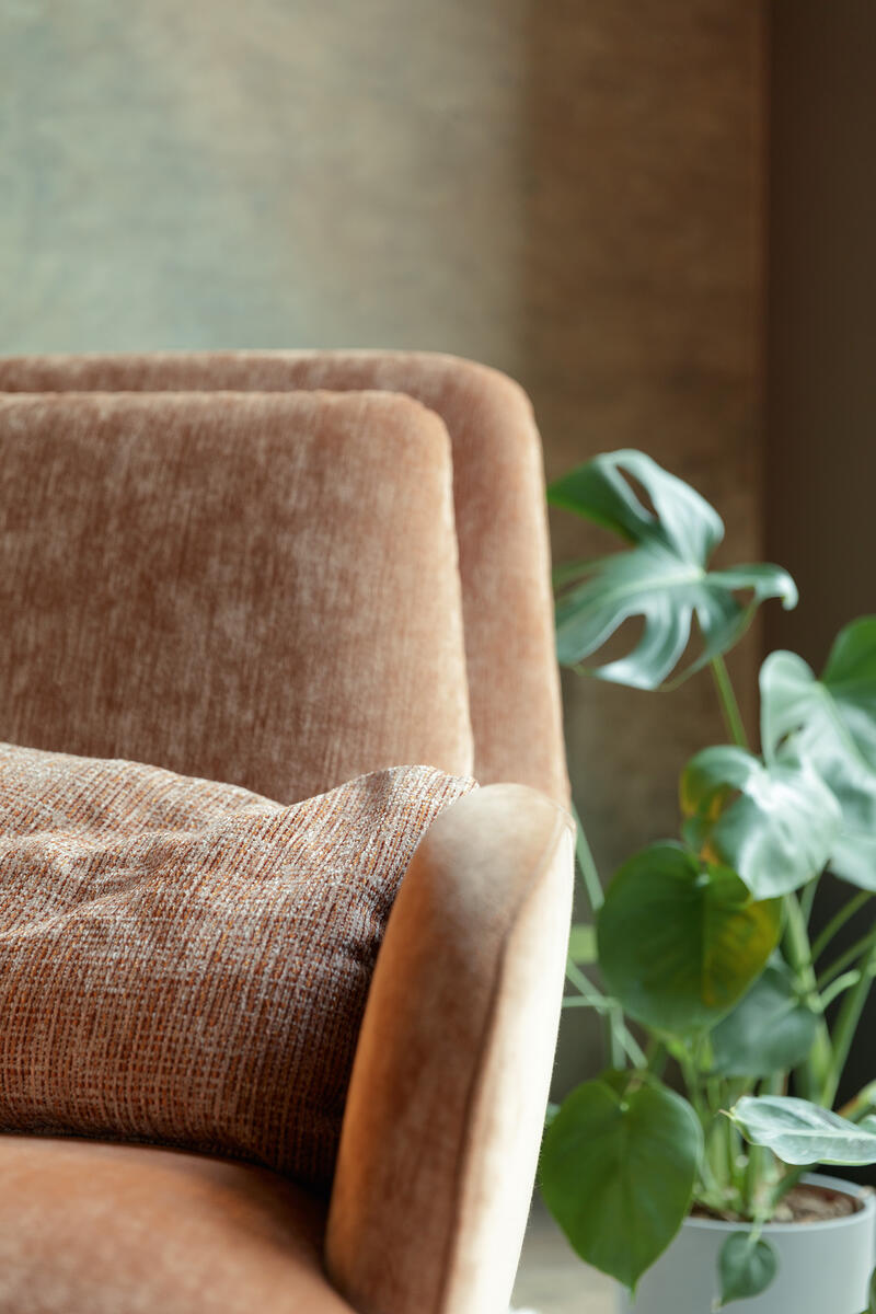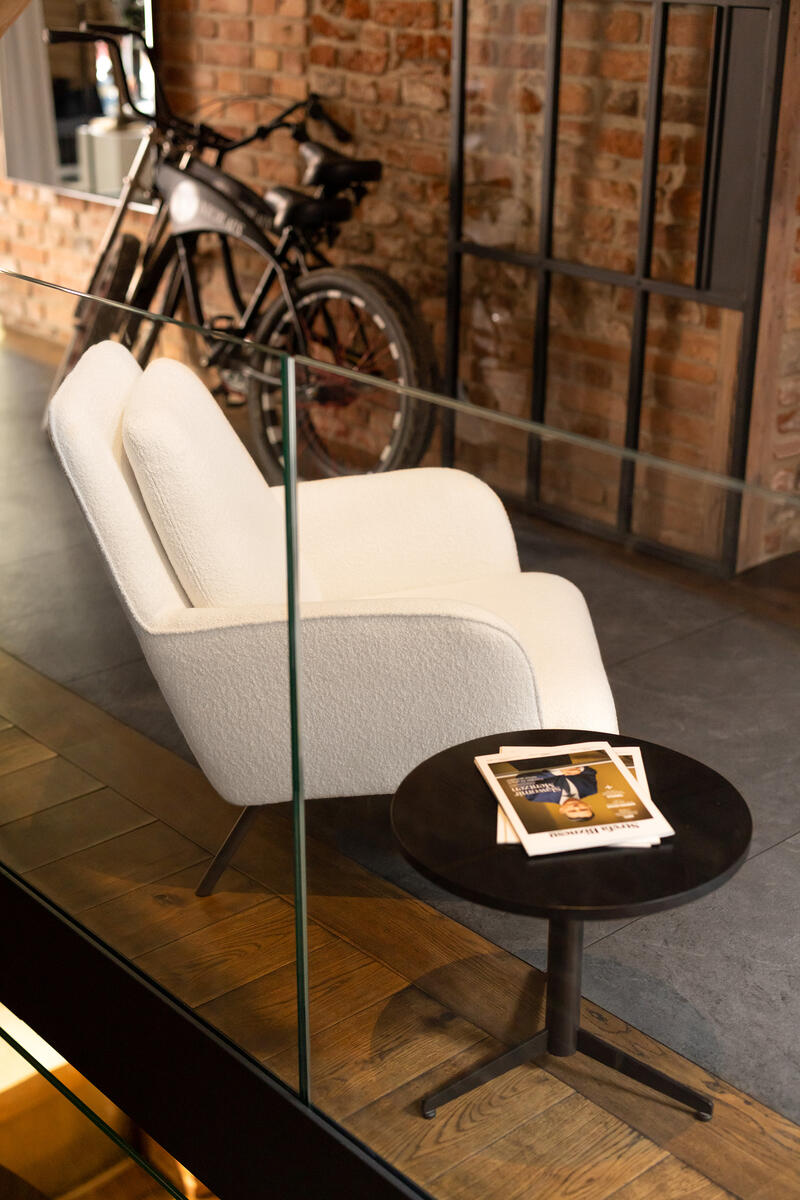 Design čalouněného křesla klade důraz na komfort a funkčnost. Tenké linie a výrazná kovová podnož.