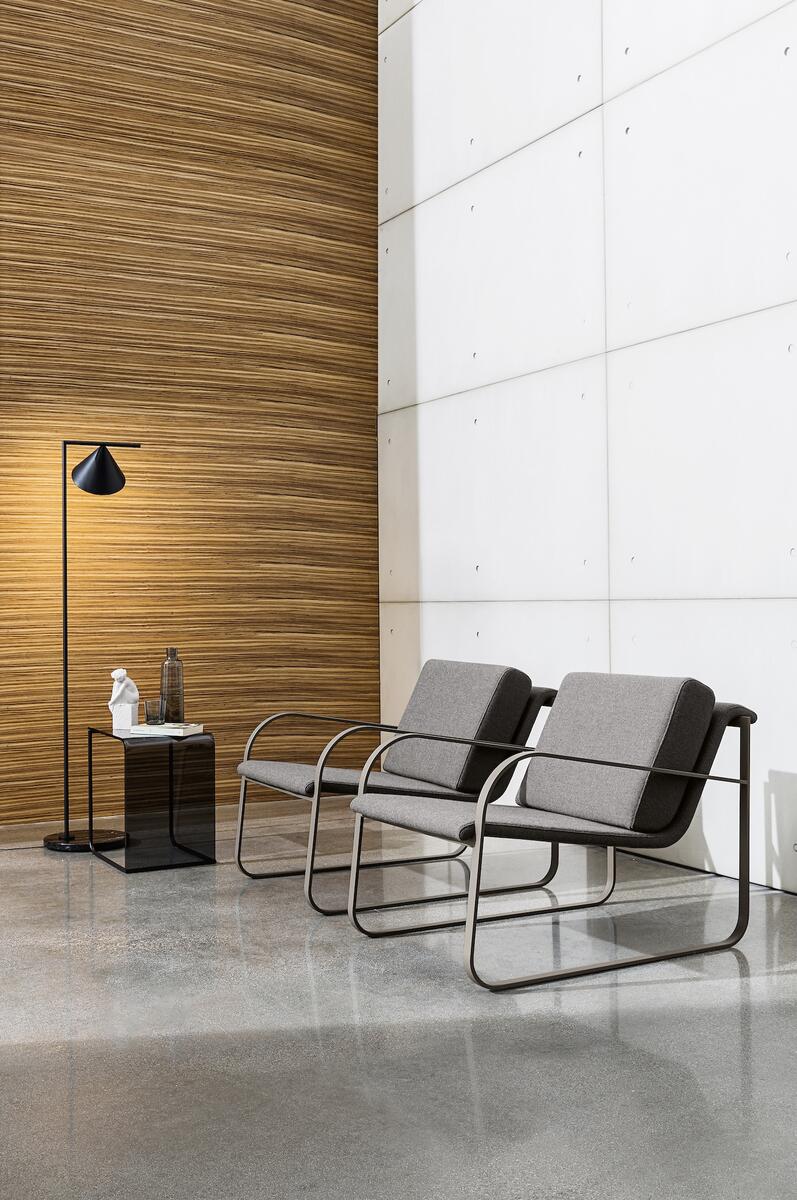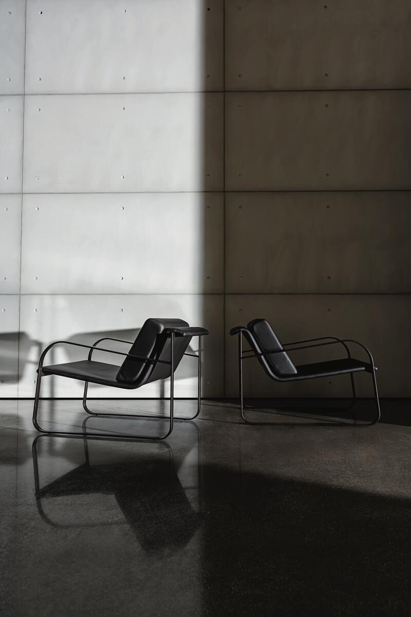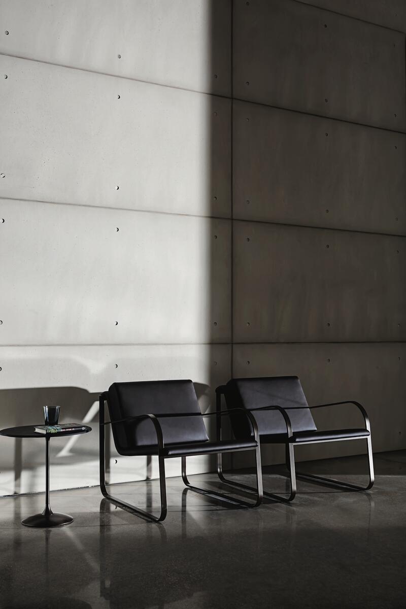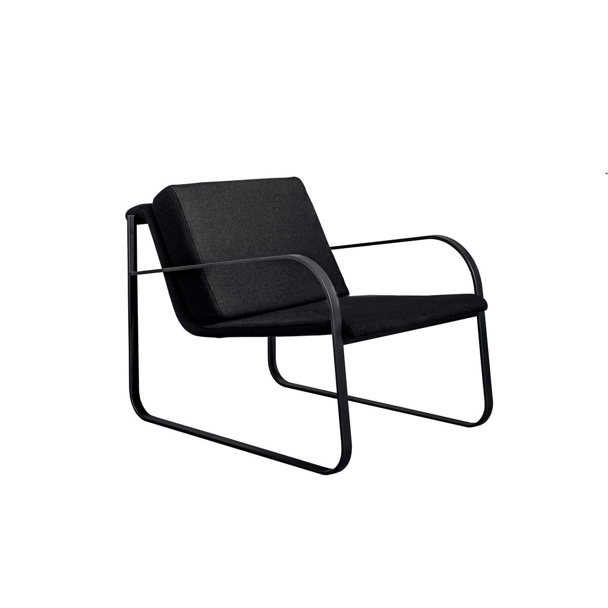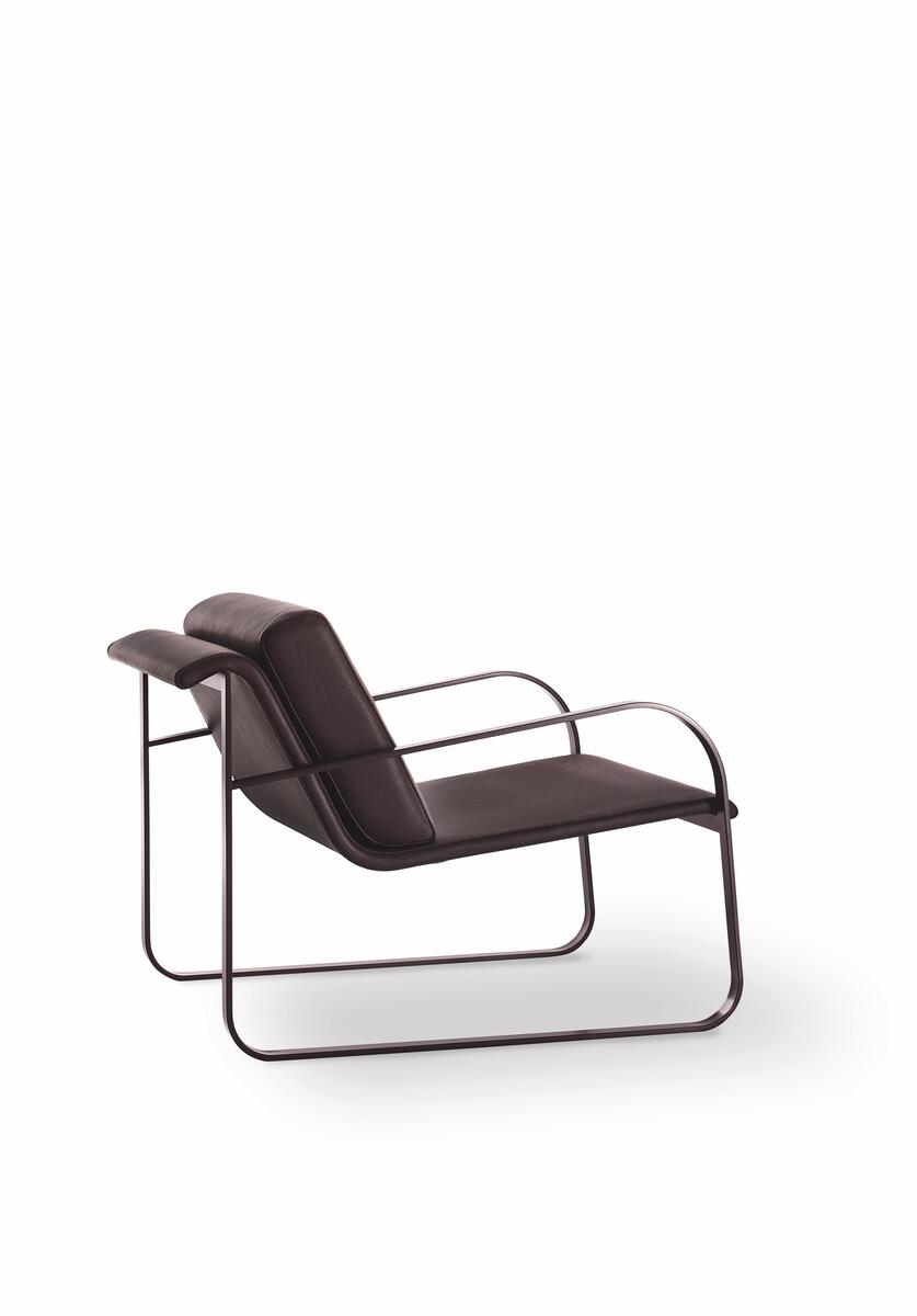 Ikonický design. Nízké křeslo s područkami a kovovým rámem.