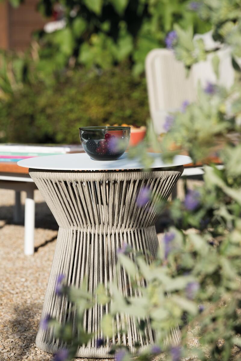 Moderní odkládací stolek s výpletem z lana. Vhodný pro venkovní i interiérové prostory.