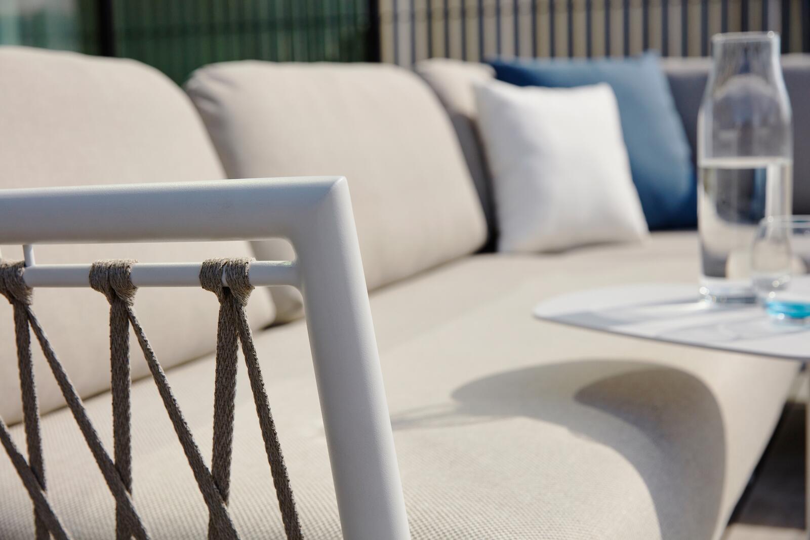 Pohovka Diamond nabízí odolný hliníkový rám a ručně tkaný provaz, což zajišťuje dlouhou životnost a elegantní vzhled. Voděodolné polstrování přispívá k maximálnímu pohodlí a snadné údržbě.