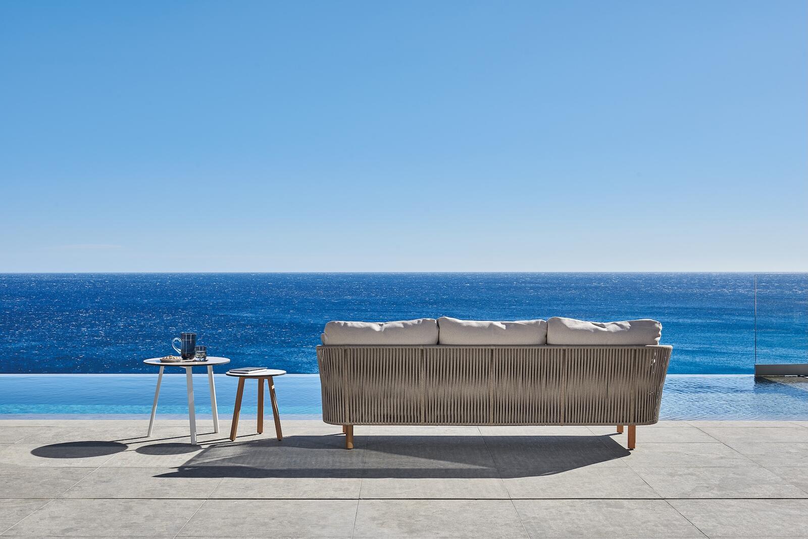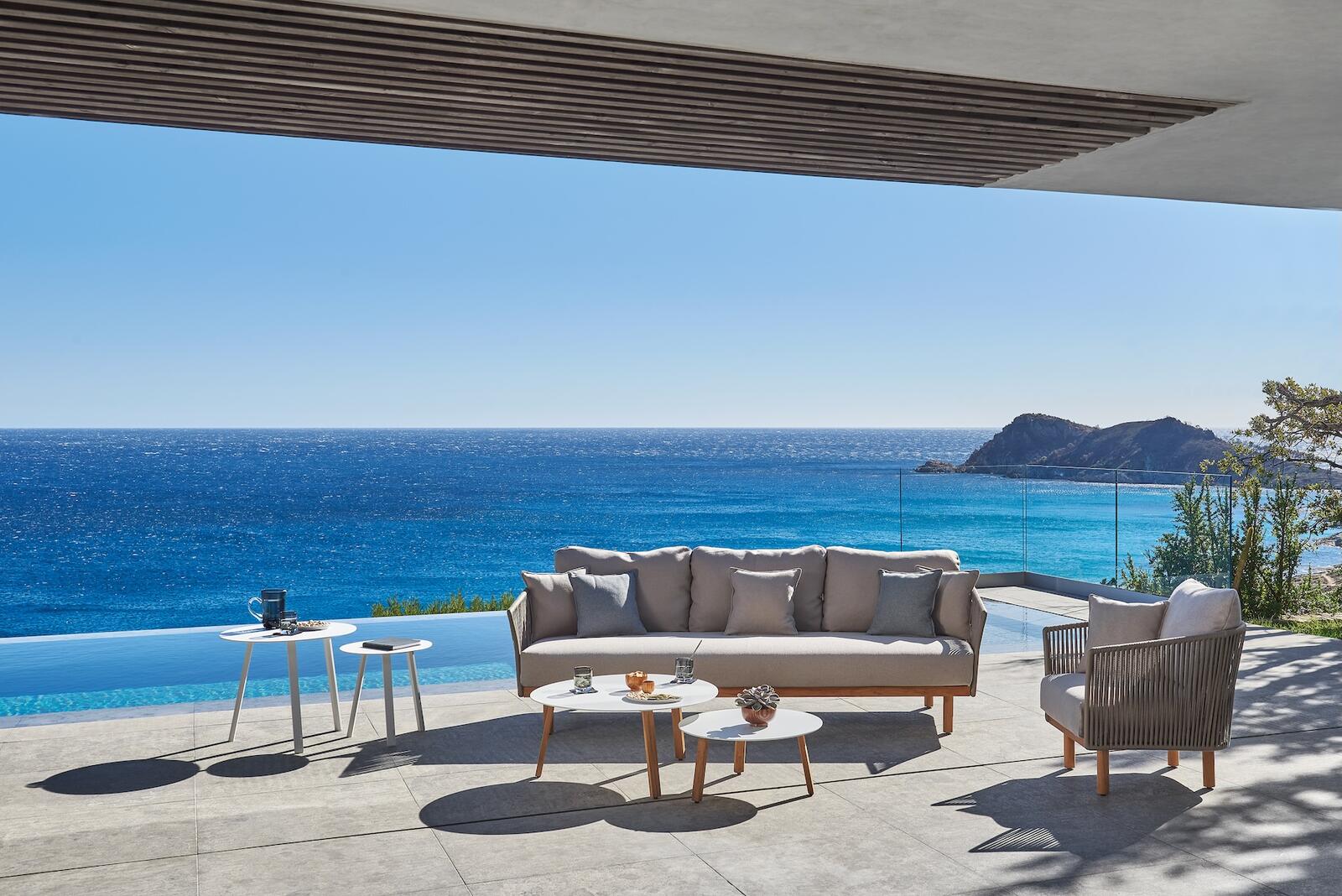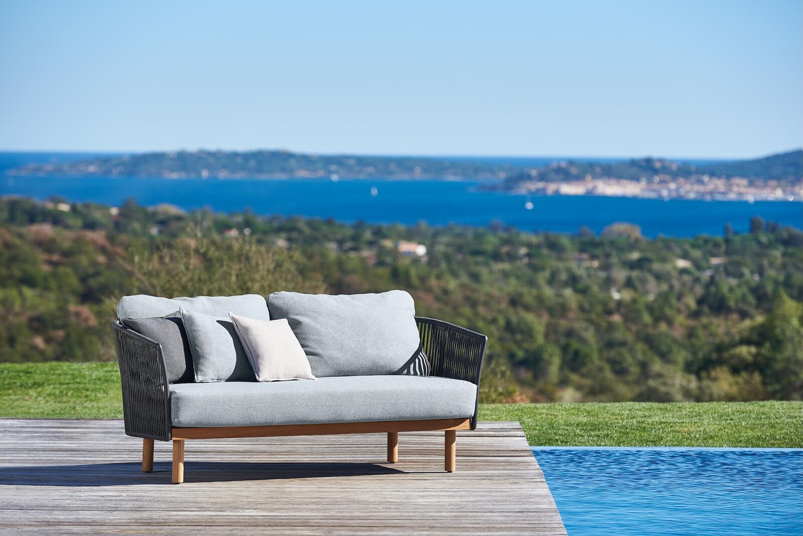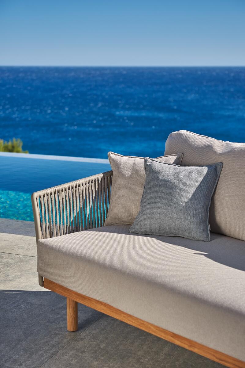 Elegantní venkovní pohovky pro 2 nebo 3 osoby s teakovými detaily a komfortními polštáři.