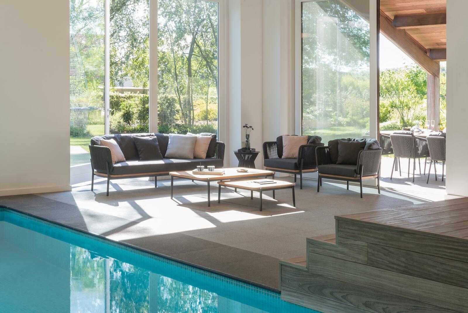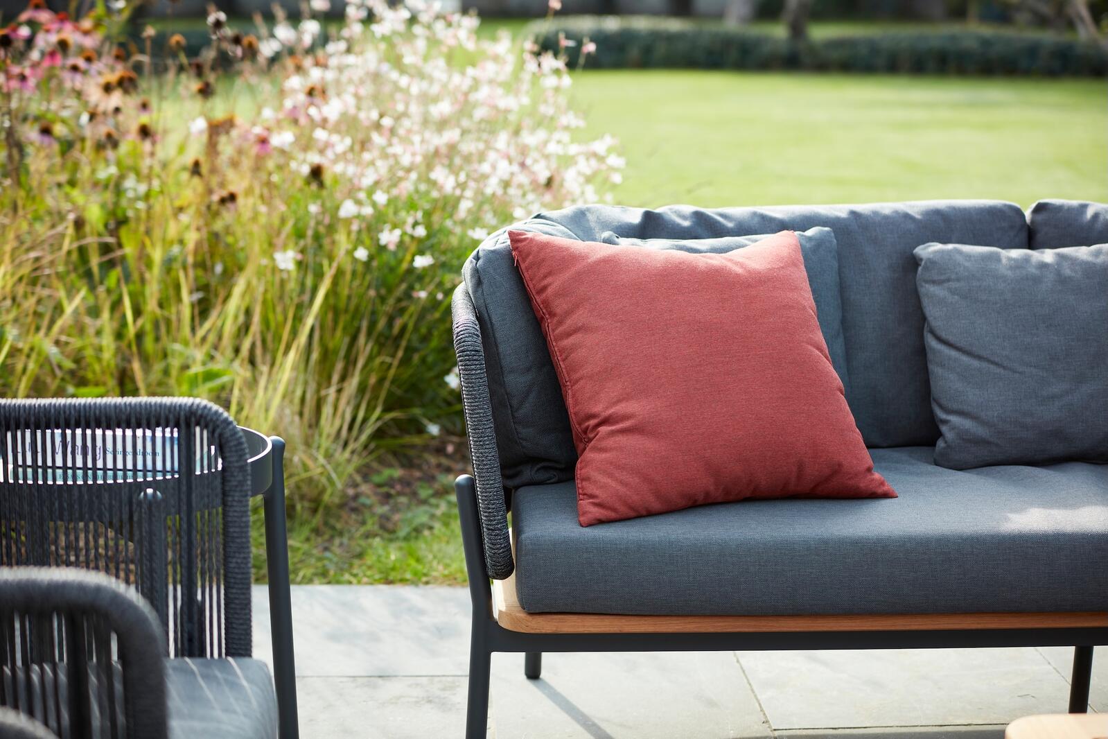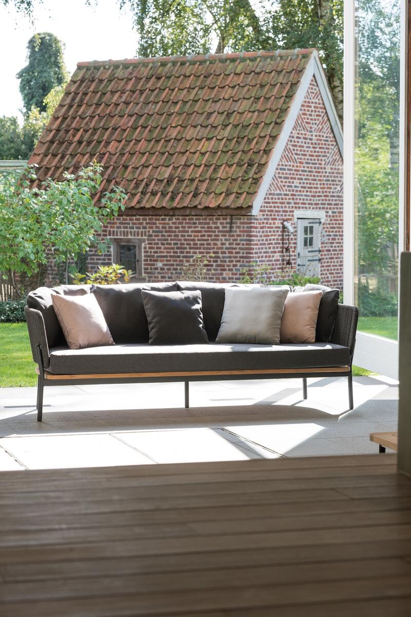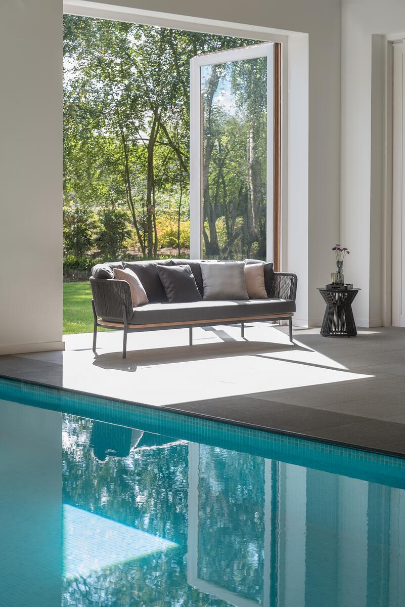 Moderní třímístná venkovní sedačka s pohodlnými polštáři. Možnost venkovního setu s křesly.