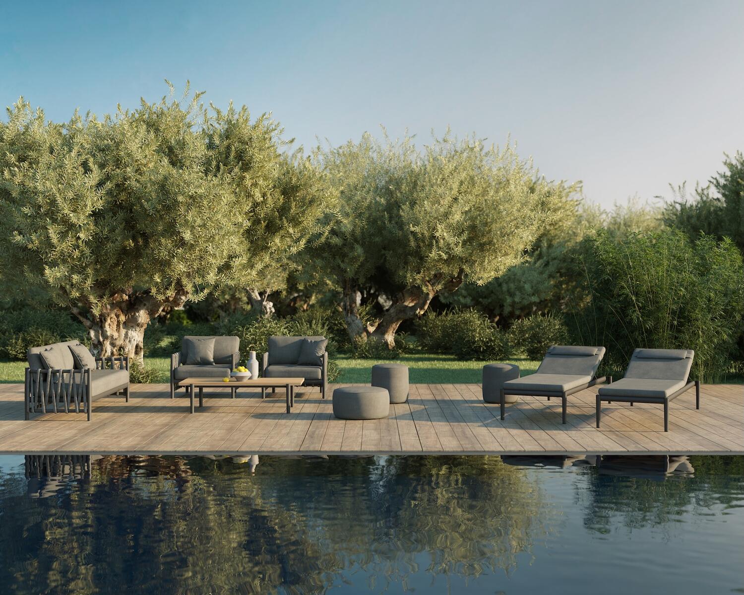 Hliníkový rám zajišťuje stabilitu, zatímco voděodolný potah polstrování přispívá k dlouhé životnosti a pohodlí. Tento set je ideální pro terasy, zahrady nebo venkovní lounge prostory, kde je kladen důraz na komfort a design.