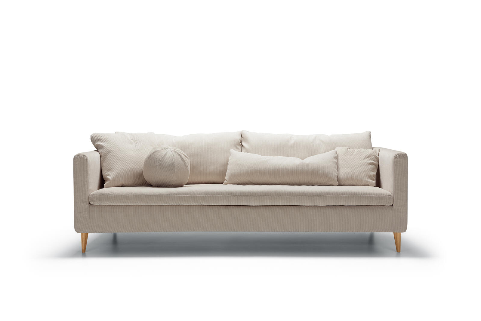 Jednoduchý design a čisté linie. Dvoumístná nebo třímístná pohovka s péřovou výplní.