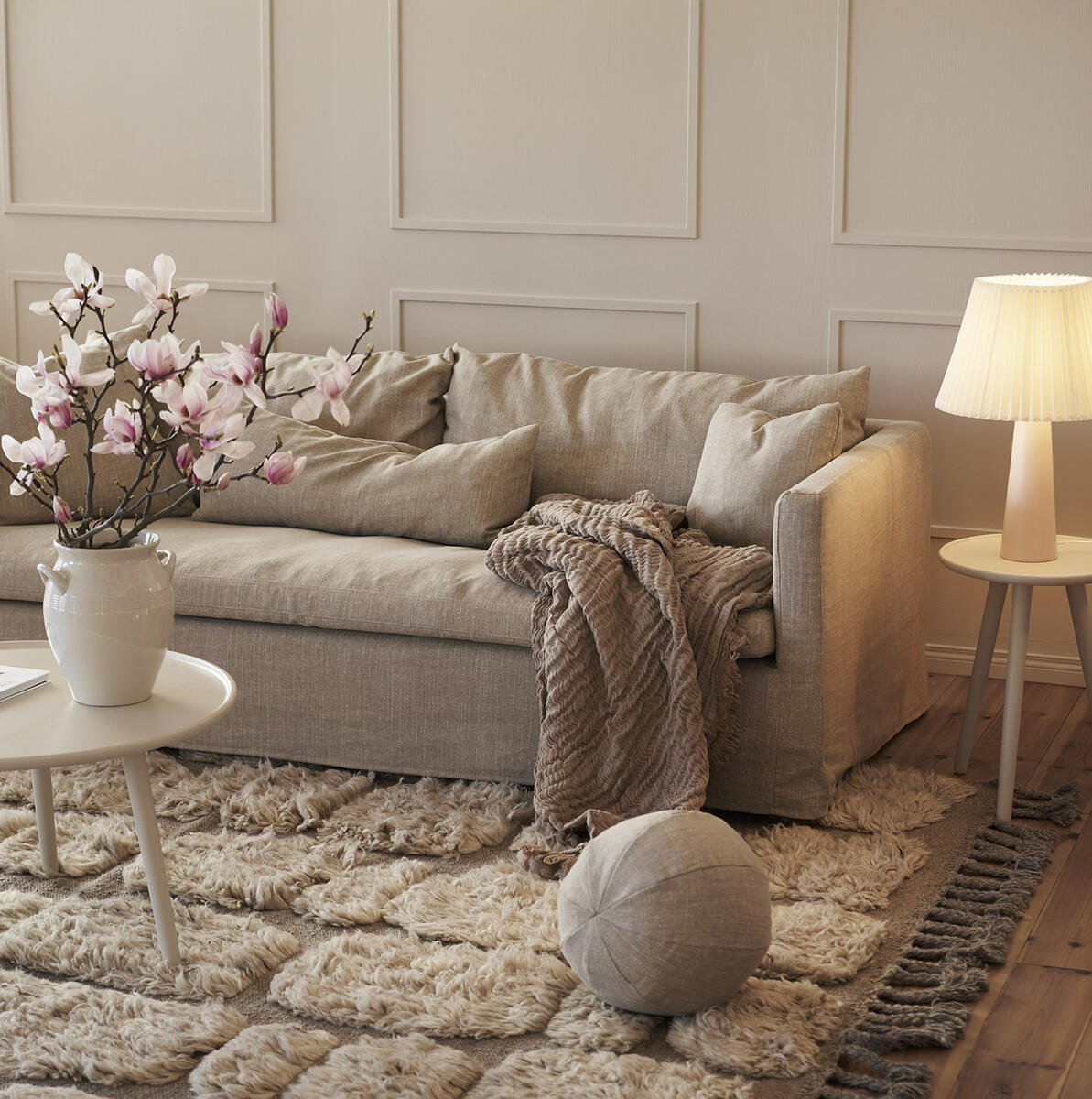 Pohovce sluší přírodní materiály jako je len. Béžové odstíny látek a přírodní struktura. Varianta snímatelné potahu je praktická z důvodu péče o látku.