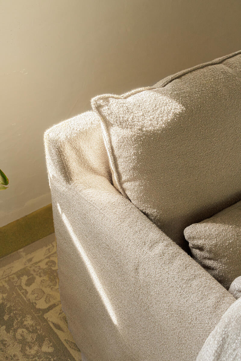 Sedačce sluší přírodní struktury a béžové odstíny. Dřevěná dubová podnož může být nahrazena tenkou kovovou podnoží.