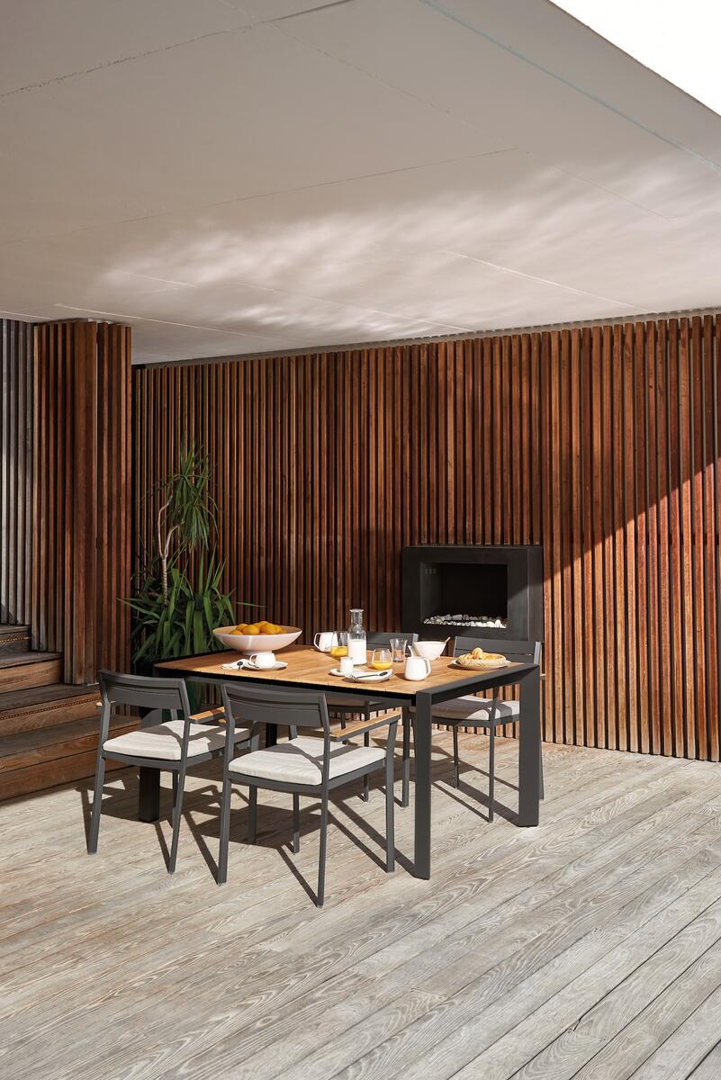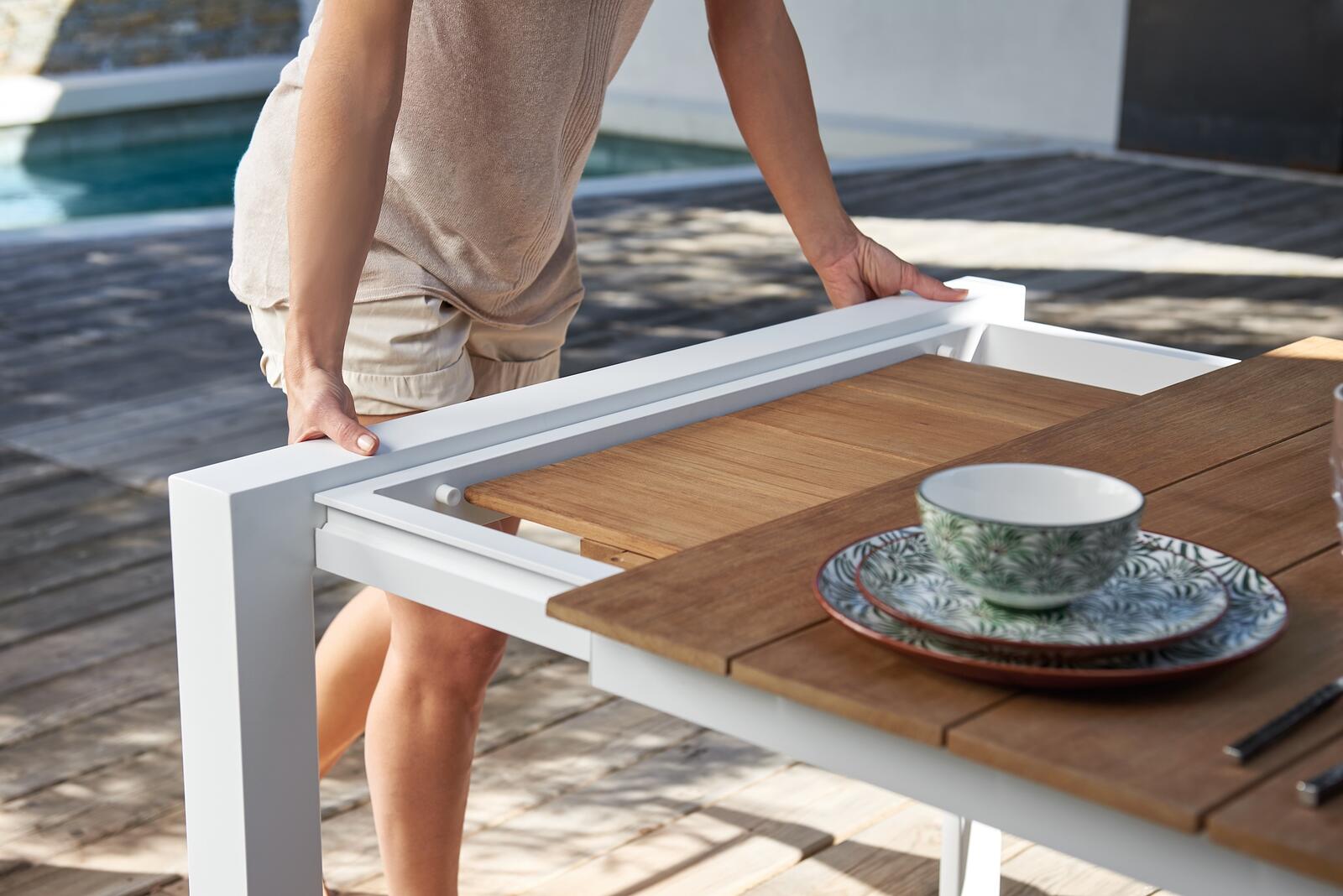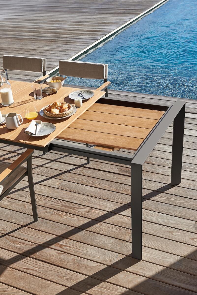 Rozkládací venkovní stůl Alexa je k dispozici ve dvou velikostech: 160–220 cm (pro 6 osob) a 220-280 cm (pro 8 až 10 osob). Vyrobený z kvalitního teakového dřeva a hliníkového rámu, je odolný vůči povětrnostním vlivům a snadno udržovatelný.
