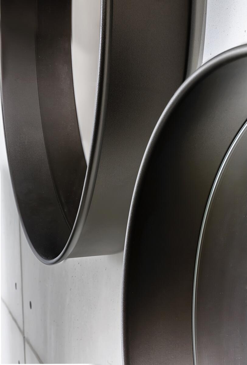 Kolekce kulatých nástěnných zrcadel Horizon přináší hravý design a možnosti vlastního přizpůsobení. Rozdílné velikosti přináší možnost různých kombinací a kompozic. Model zrcadla je perfektní do koupelny, chodby, ložnice, k toaletnímu stolku nebo jako dekorativní zrcadlo na zeď obývacího pokoje. Hliníkový rám v provedení bílé, černé, tmavě hnědé a šedé barevné variantě lze libovolně kombinovat s čirým, kouřovým nebo bronzovým zrcadlem. Jako designový prvek můžete zvolit matný pruh skla na zrcadle, který dodává zrcadlu prvek uměleckého objektu.